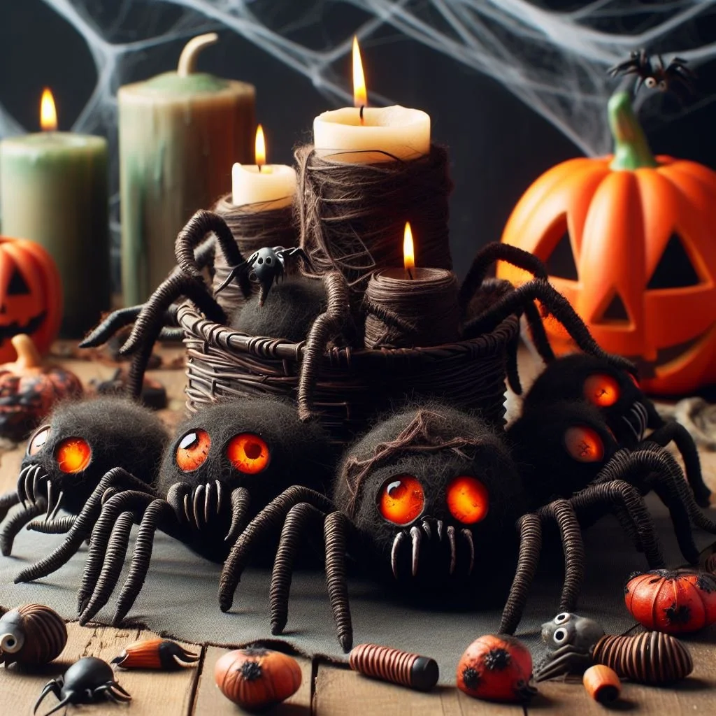 Make your candles extra creepy with DIY candle holders covered in fake spiders. Start by using black spray paint to coat glass or metal candle holders, ensuring an even, dark finish. Once the paint is dry, hot glue small plastic spiders all over the holders, arranging them in clusters for maximum spookiness. The combination of the black base and the creepy-crawly spiders creates a spine-tingling decoration perfect for Halloween. Place candles inside and watch as the eerie glow highlights the sinister details, adding a chilling touch to your festive decor. These spider-covered candle holders will surely delight and frighten your guests.