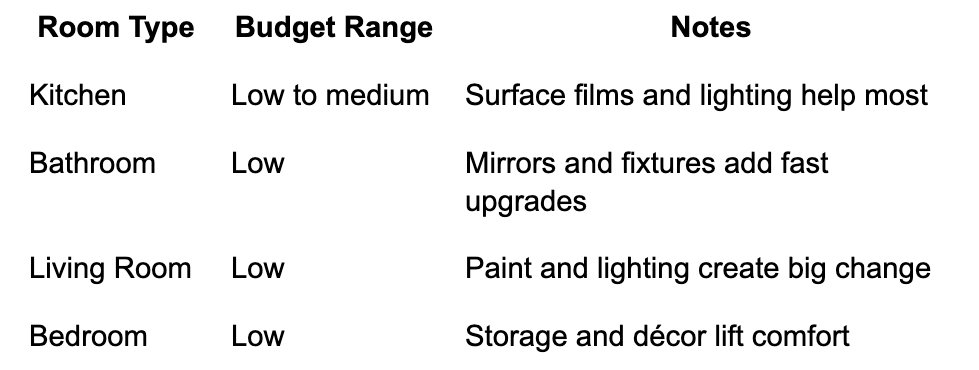 Start with surfaces seen the most. Cabinets, walls, and floors give clear results. Lighting changes the feel of every room and costs little when planned well.
