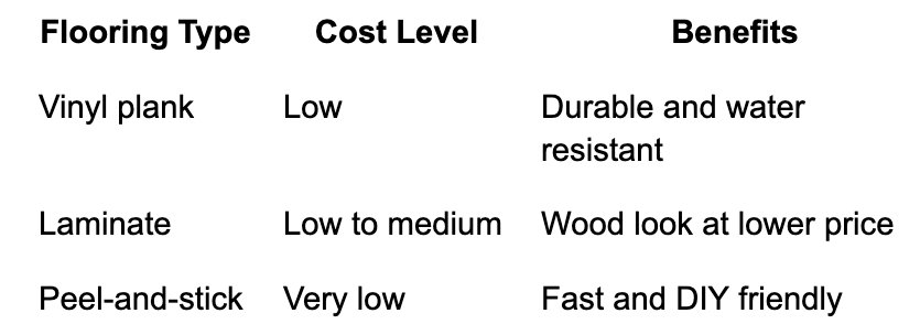 Vinyl planks are a strong option for low-cost flooring. They lock together and handle daily wear well. Laminate provides a wood look without the high cost. Peel-and-stick tiles suit small rooms and DIY users.