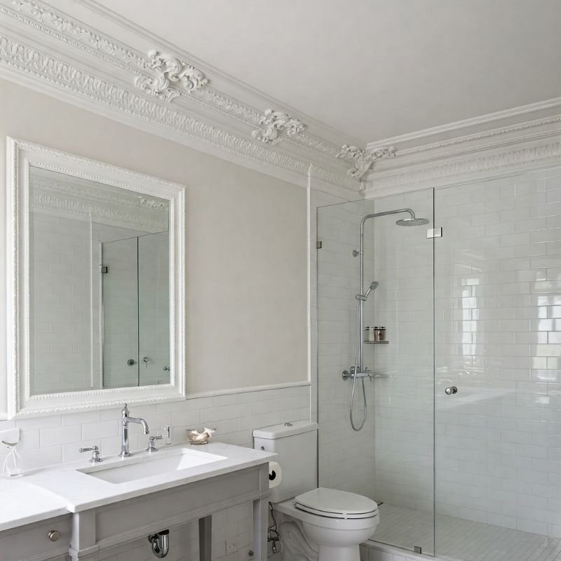 Crown molding introduces architectural character that elevates basic bathrooms to custom-designed spaces. Surprisingly affordable at $1-$3 per linear foot for basic styles, this addition frames your ceiling like custom matting frames artwork. Paintable plastic options resist bathroom humidity while remaining lightweight enough for DIY installation. The impact is subtle but significant—like the difference between a handwritten note and a typed message, adding personality that feels distinctly more premium. This detail suggests intentional design choices rather than builder-basic standards, creating the impression of custom construction without custom prices. For smaller bathrooms, choose narrower profiles that add definition without overwhelming the proportions of the space. The resulting look is polished and complete—a finishing touch that ties the room together.