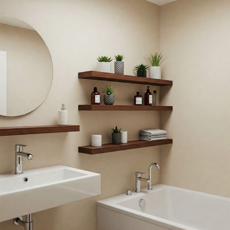 Floating shelves deliver architectural interest and practical storage for approximately $20-$50 per shelf. Unlike bulky cabinets that can overwhelm small bathrooms, these streamlined solutions add function without visual weight—like switching from heavy winter boots to sleek running shoes. Install them above toilets, beside vanities, or on empty walls to display decorative items while keeping essentials within reach. The exposed storage encourages curating your prettiest containers and towels, elevating everyday items to design elements. For budget maximization, consider basic brackets with unique materials atop—reclaimed wood, marble remnants, or painted MDF all create custom looks without custom prices. The result feels purposeful and designed rather than merely utilitarian, suggesting thoughtful planning rather than storage desperation.