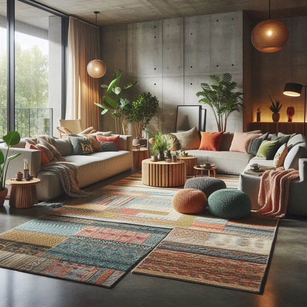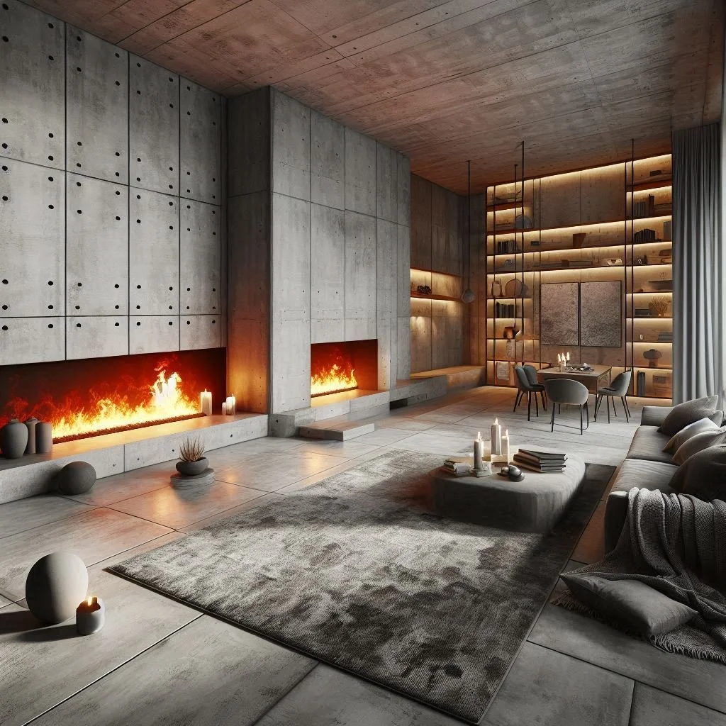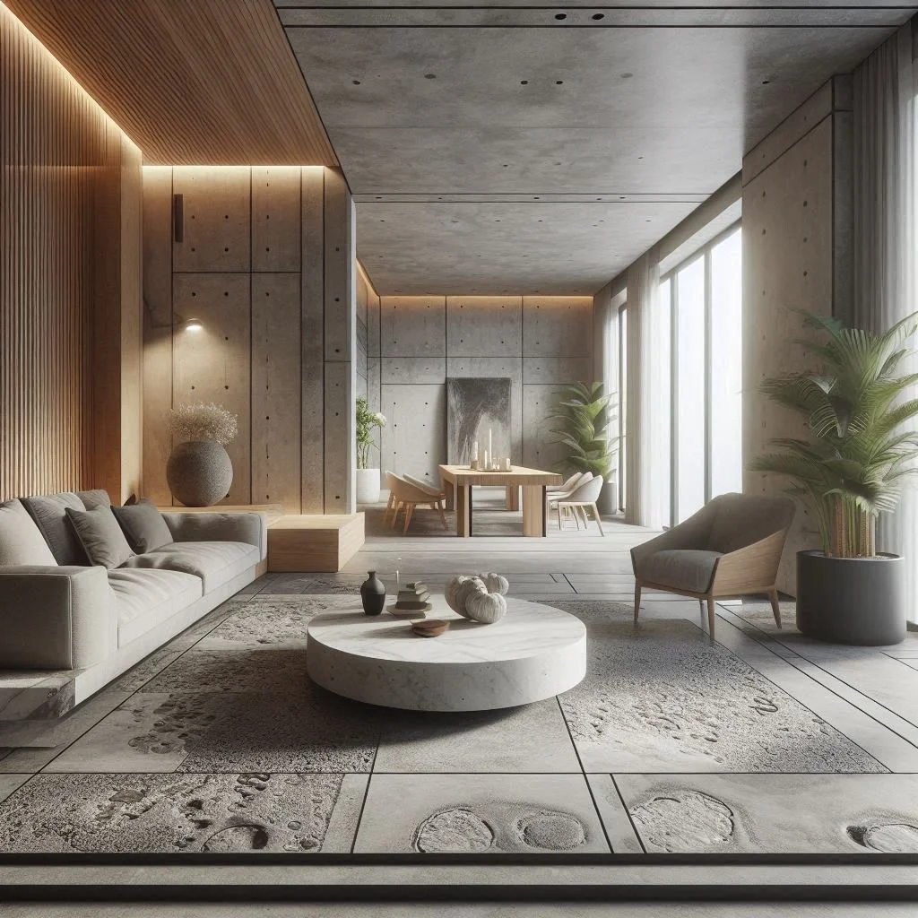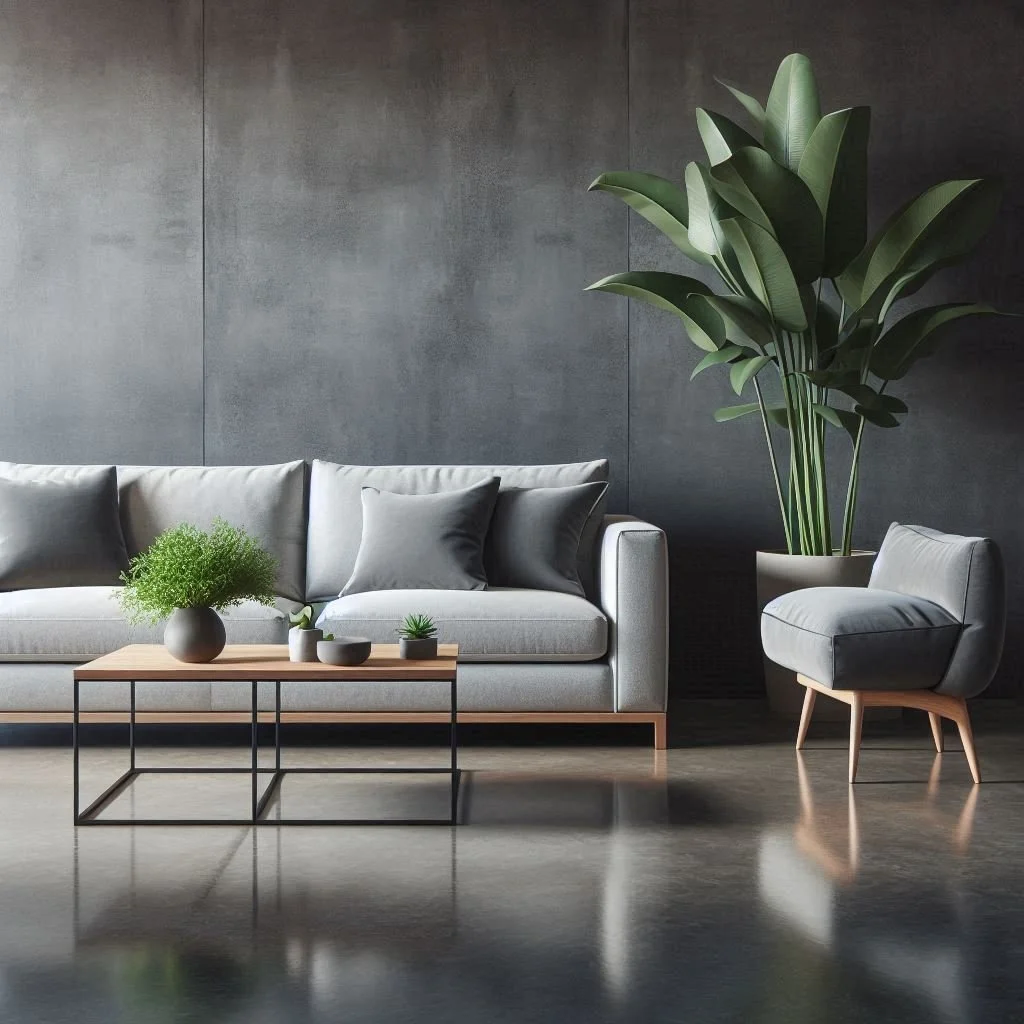 Concrete floors in the living room offer a unique blend of edgy sophistication and timeless elegance, making them a versatile choice for various design styles. Their sleek, minimalist appeal serves as a neutral foundation, complementing industrial, modern, or even rustic aesthetics. To balance the coolness of concrete and add warmth, layer the space with soft rugs, cozy textiles, and plush furnishings. These elements not only enhance comfort but also create a welcoming and balanced ambiance. Concrete’s durability and low-maintenance qualities make it an ideal option for high-traffic areas, ensuring both functionality and style. Whether paired with exposed brick and metallic accents for an industrial vibe or with wooden furniture and earthy tones for a rustic touch, concrete floors provide a striking yet adaptable backdrop. With thoughtful decor, they transform your living room into a chic and inviting space that feels effortlessly refined.
