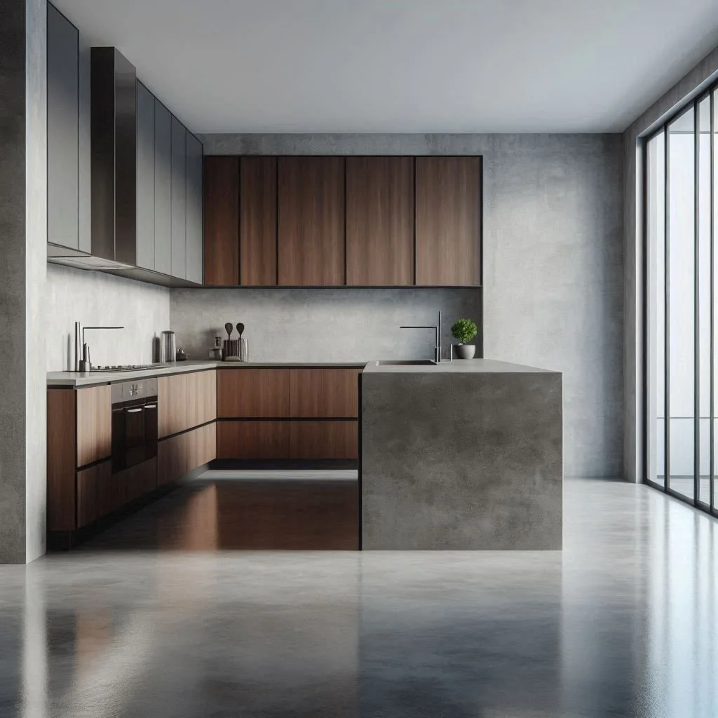 Concrete floors are an excellent choice for kitchens, offering a combination of practicality, durability, and low maintenance. Their resilience makes them ideal for high-traffic areas, while their versatility allows for a variety of design options. Polished or stained concrete introduces a sleek, modern aesthetic, perfect for contemporary spaces, while stamped or textured finishes add warmth and character, creating a more inviting atmosphere. Pair these floors with sleek cabinetry and metallic accents, such as stainless steel appliances or brushed nickel fixtures, to enhance the room’s contemporary appeal. Concrete’s adaptability ensures it complements a range of styles, from minimalist to industrial chic. In addition to their aesthetic versatility, concrete floors are easy to clean and maintain, making them a functional yet stylish foundation for your kitchen. By choosing concrete, you combine modern design with everyday practicality, achieving a space that is both beautiful and durable.