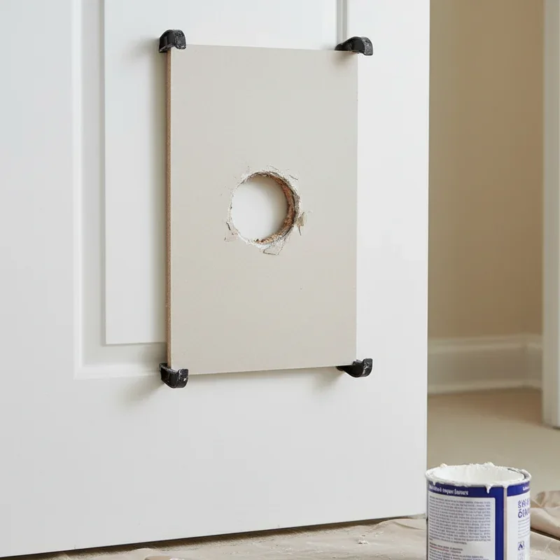 Large holes in hollow-core doors require creating a solid backing. Cut a piece of thin plywood or sturdy cardboard larger than the hole. Attach strings to the corners of this backer board. Insert it through the hole, position it behind the opening, and pull the strings to hold it tight against the inner surface.