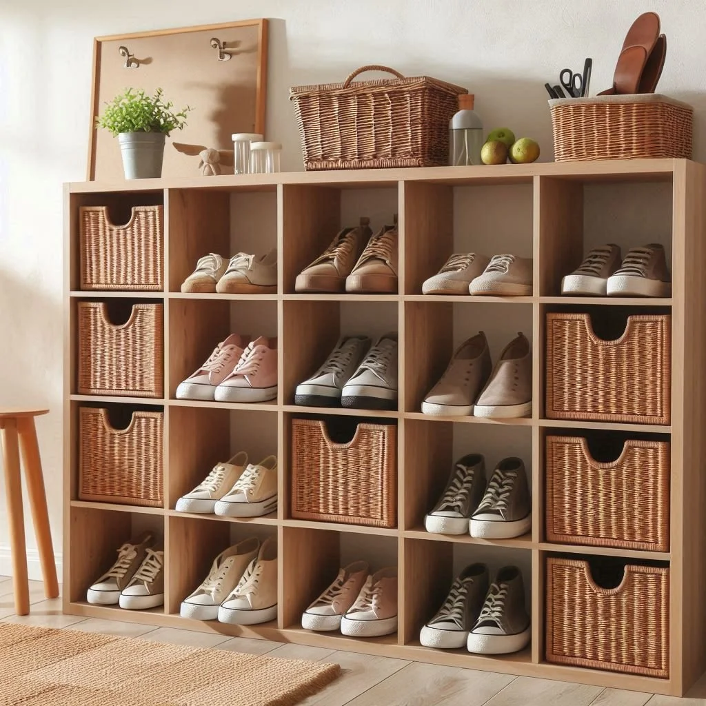 Cubby shelves with baskets offer a stylish and functional way to organize your shoes. Utilize each cubby to house a pair of shoes, ensuring effortless access and a clutter-free display. Meanwhile, the accompanying baskets offer a practical storage solution for accessories such as socks, belts, or shoe polish, keeping essentials within reach while maintaining a tidy appearance. This versatile setup not only maximizes space efficiency but also adds a rustic charm to your living space, infusing it with warmth and character. Whether placed in an entryway, bedroom, or closet, cubby shelves with baskets offer a chic and practical solution to keep your footwear and accessories organized while enhancing the aesthetic appeal of your home.