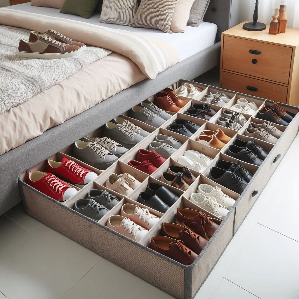 For a more streamlined look, opt for fabric under-bed shoe storage boxes. Crafted from lightweight yet durable materials, these boxes effortlessly slide beneath your bed, making efficient use of underutilized space. Featuring clear windows or labels, they offer easy visibility and quick identification of the contents within, eliminating the hassle of rummaging through cluttered piles. Whether storing seasonal shoes or everyday essentials, these fabric boxes provide a sophisticated and practical storage option that seamlessly integrates into any bedroom decor. With their blend of functionality and style, fabric under-bed shoe storage boxes offer a chic solution to keep your footwear collection neatly organized and out of sight.