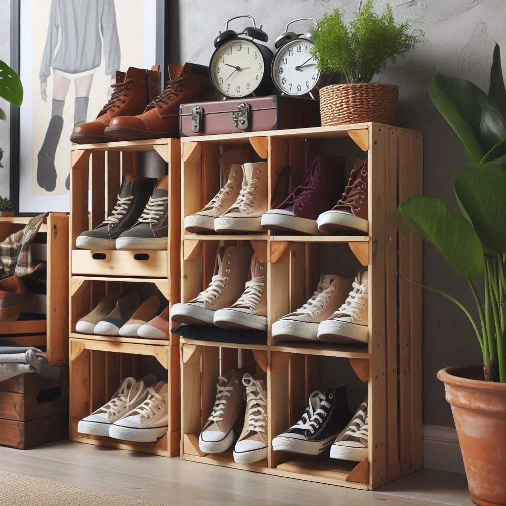 Repurpose wooden crates into rustic-chic shoe storage with this simple DIY project. Whether stacked horizontally or vertically, these rustic-chic crates offer versatile storage options for shoes, boots, or even handbags, adding both functionality and aesthetic appeal to your space. Leave the crates unfinished for a natural, rustic look, or unleash your creativity by painting them to complement your decor scheme. The beauty of this project lies in its simplicity and adaptability, allowing you to customize the crates to suit your style preferences and storage needs. Embrace the rustic charm of wooden crates and transform them into a stylish and practical storage solution that enhances the organization and ambiance of your home.