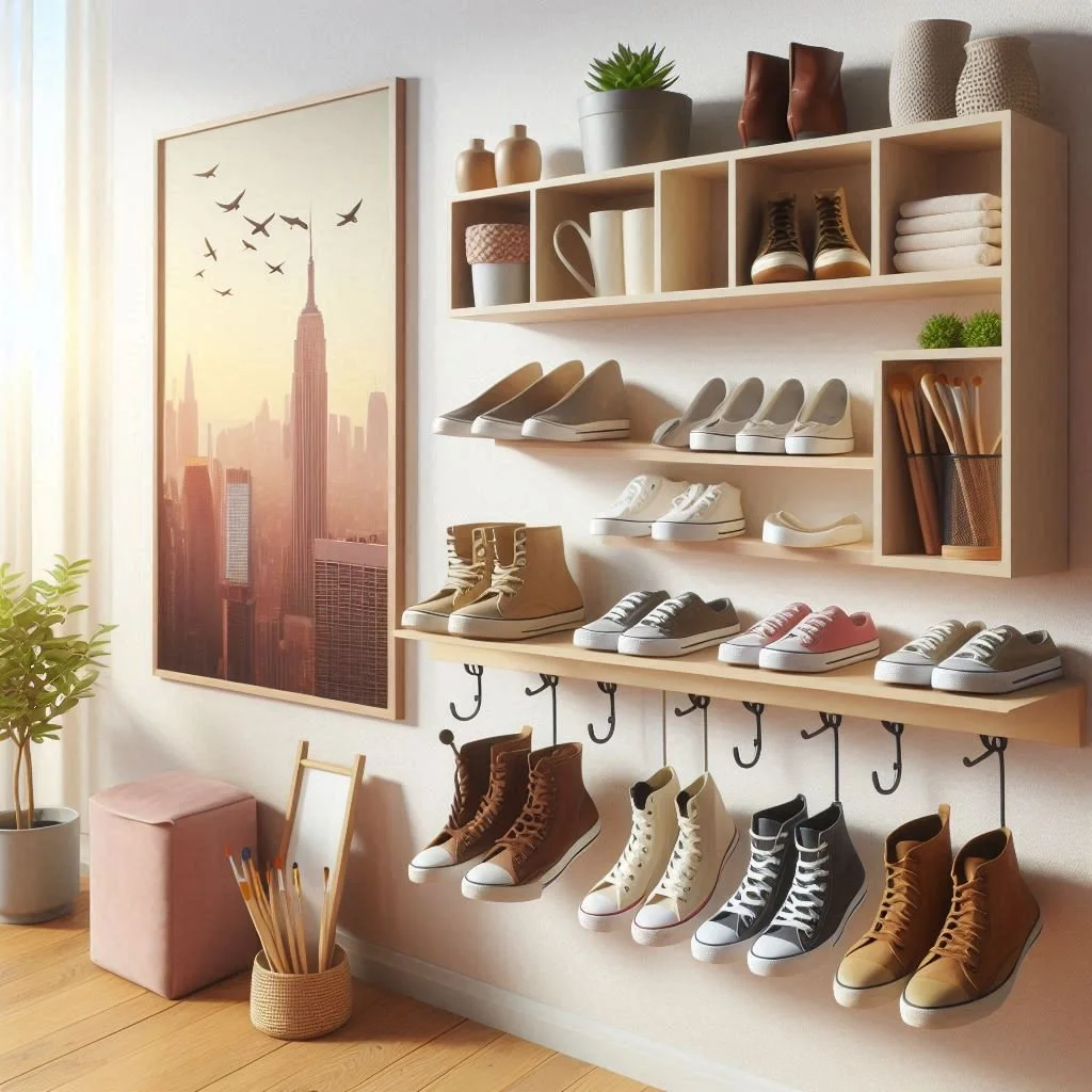 If floor space is at a premium, consider installing floating wall shelves with hooks for hanging shoes. Easily installed at any height, these shelves provide versatile storage options for shoes of various sizes, keeping your footwear neatly organized and easily accessible. The added hooks offer extra versatility, allowing you to hang accessories such as hats, scarves, or keys for added convenience. Whether placed in an entryway, bedroom, or closet, these floating shelves blend seamlessly into any space, providing a stylish and efficient storage solution that helps declutter your home while adding a touch of modern elegance. Say goodbye to cluttered floors and hello to a well-organized and visually appealing shoe storage system with floating wall shelves and hooks.