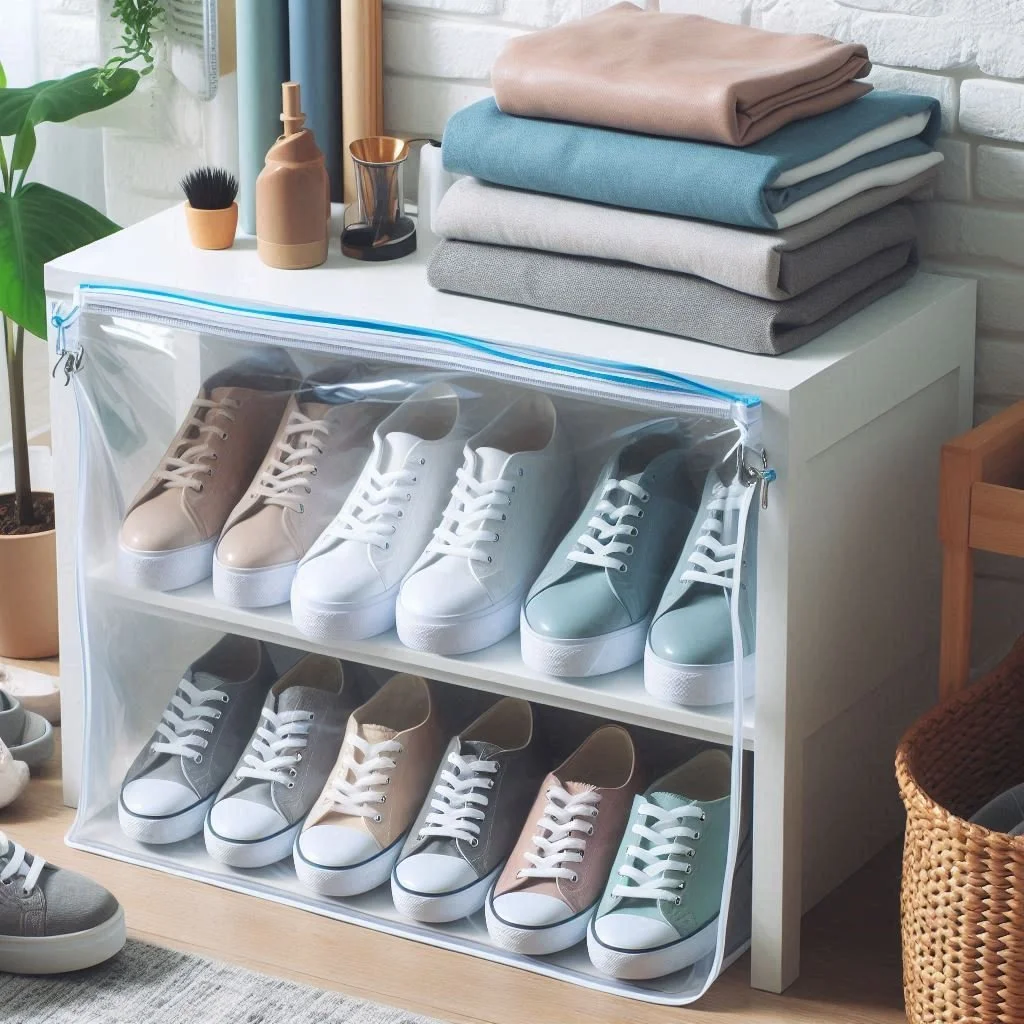 For those who prefer a more discreet storage solution, clear plastic shoe bags are a great option. Slip each pair of shoes into its own bag and hang them on a closet rod or hook, effortlessly keeping your footwear organized and protected from dust. This minimalist approach not only preserves the pristine condition of your shoes but also maximizes floor space, making it an ideal option for smaller closets or apartments. With each pair neatly encased in its transparent bag, you can easily locate and access your shoes while maintaining a clutter-free and tidy closet environment. Say goodbye to shoe piles and hello to streamlined storage with clear plastic shoe bags, the perfect blend of functionality and simplicity.