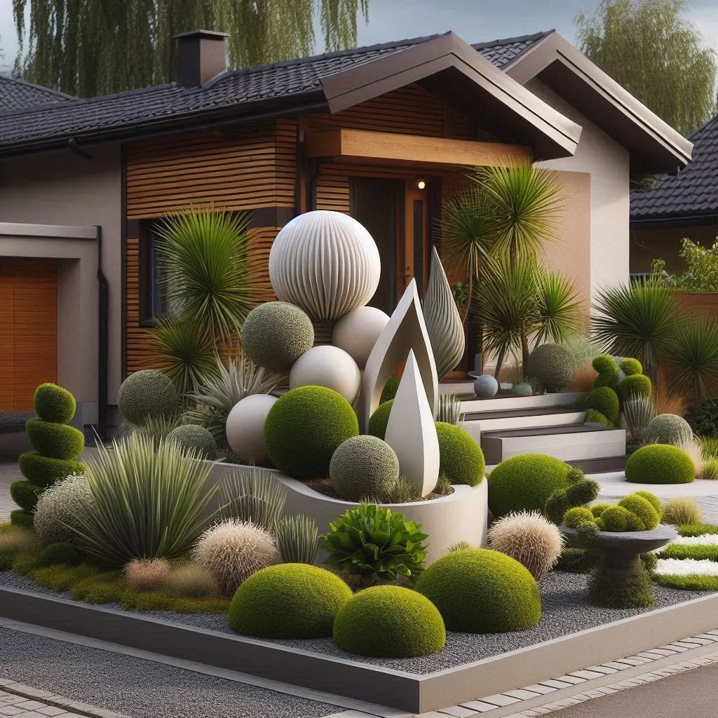 Add a contemporary touch to your front yard with modern sculptural elements that serve as focal points and conversation starters. From sculptures and statues to art installations, these captivating pieces add a touch of artistic sophistication to your landscape design. With their clean lines, bold shapes, and innovative materials, modern sculptural elements offer a visually stunning contrast to the natural surroundings while reflecting your personal style and aesthetic preferences. Moreover, these artistic accents require minimal maintenance, making them a practical choice for busy homeowners seeking to enhance their outdoor space with ease. Embrace the creativity and elegance of modern sculptural elements as you elevate the visual appeal of your front yard, creating a captivating outdoor environment that sparks intrigue and admiration.