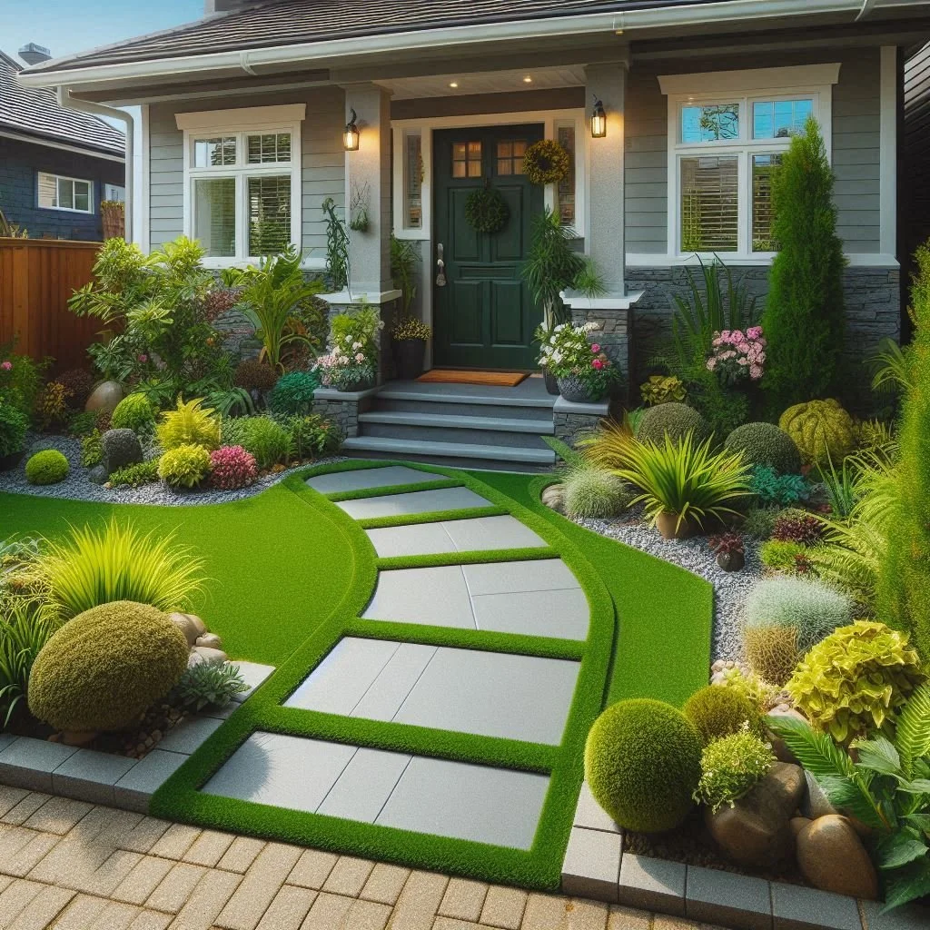 Create inviting pathways with artificial turf that add texture and visual interest to your front yard landscape. Unlike traditional pathways that demand frequent weeding and upkeep, artificial turf pathways offer a low-maintenance solution that remains lush and pristine with minimal effort. These pathways not only provide a durable and long-lasting surface but also contribute to the overall aesthetic appeal of your front yard. With their vibrant green hue and soft texture, artificial turf pathways create a welcoming ambiance while adding a touch of professionalism to your outdoor design. Embrace the convenience and beauty of artificial turf as you transform your front yard into an inviting and polished landscape that captivates guests and passersby alike.