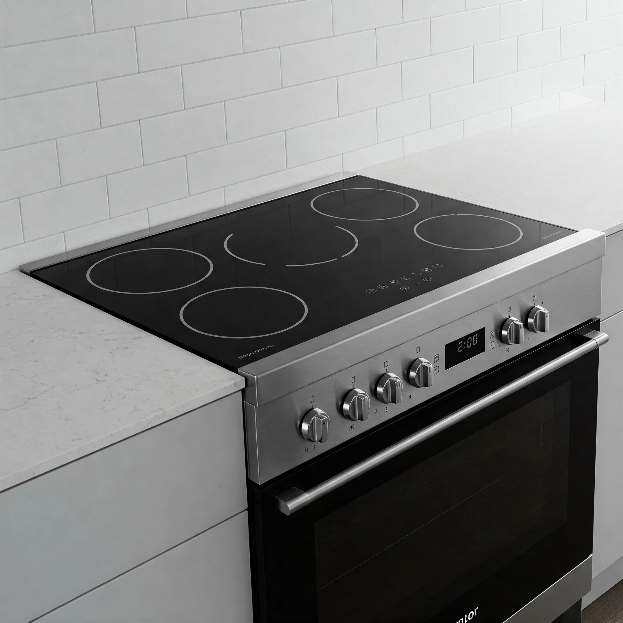 Next up: smooth top electric ranges. These are the ones with that futuristic, glass-ceramic surface. Instead of exposed coils, they conceal heating elements just under the glass. Switch on a burner, and you’ll see the glowing ring through the surface—it’s as if your stove has a built-in light show!